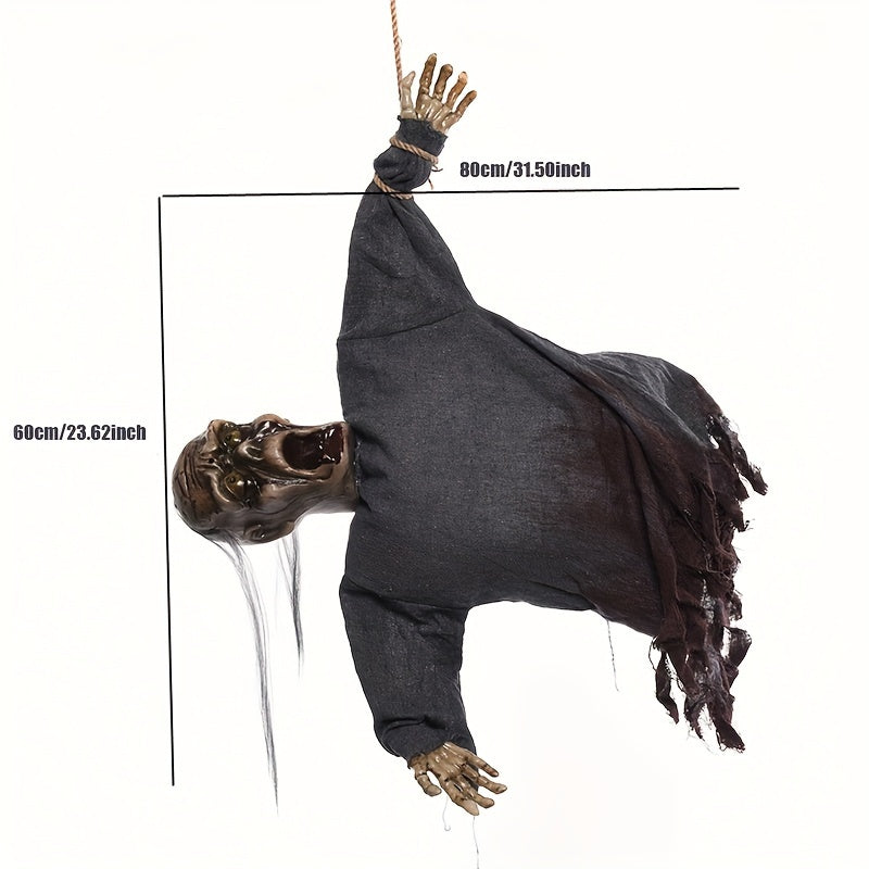 The skeleton's eyes light up with a ghastly glow, while its screaming sound creates an unsettling atmosphere that's perfect for Halloween. Made from durable fabric, this decoration is built to withstand multiple uses and bring a haunting charm to your holiday displays. Easy to hang and simple to set up, it’s an essential piece for any Halloween enthusiast looking to create an unforgettable scare.