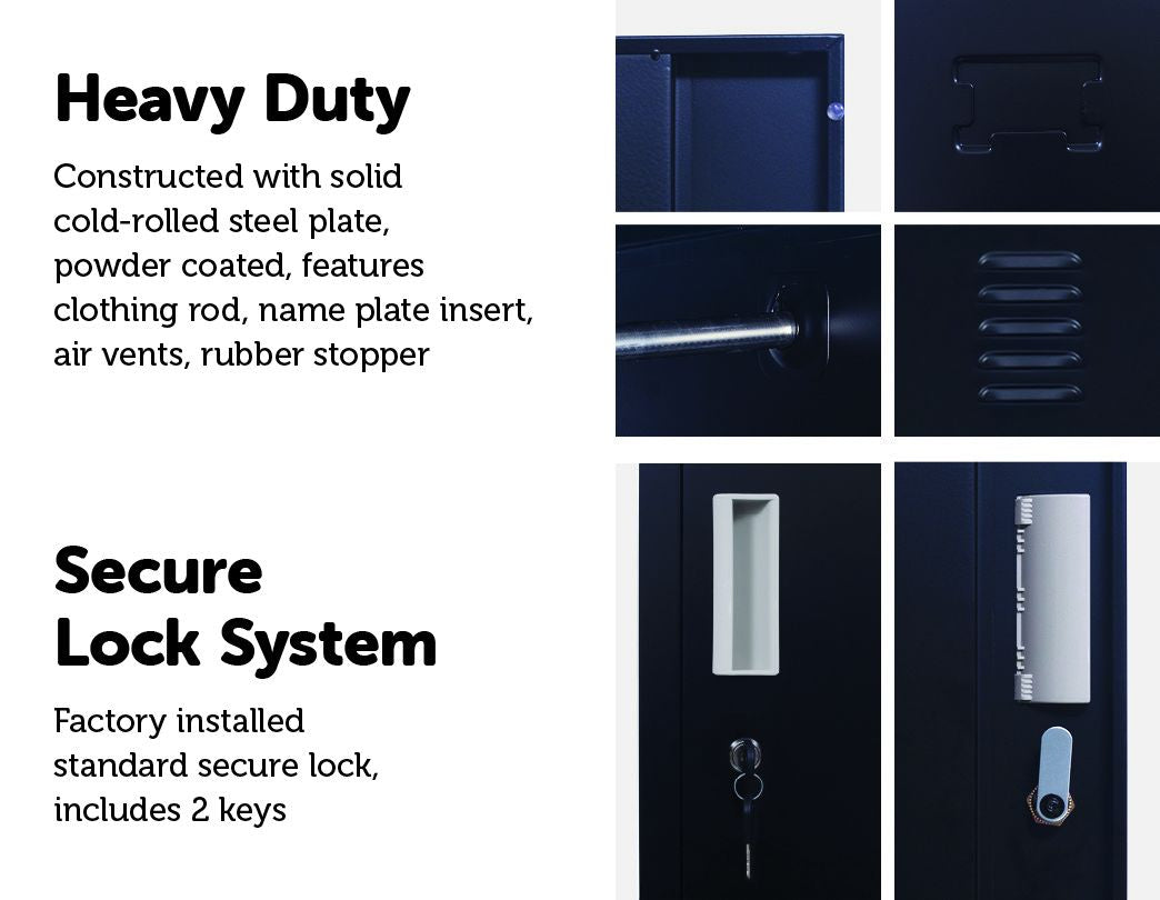 The locker is constructed with solid cold-rolled steel plate for sturdiness and durability and comes with standard locks (with 2 keys each) for worry-free storage.. The steel is also powder-coated to resist corrosion. The locker measures 180 x 38 x 45cm, and the maximum recommended weight capacity is approximately 30kg per locker. There are spaces designated for labels to help identify lockers, and air vents are built-in to assure sufficient ventilation.