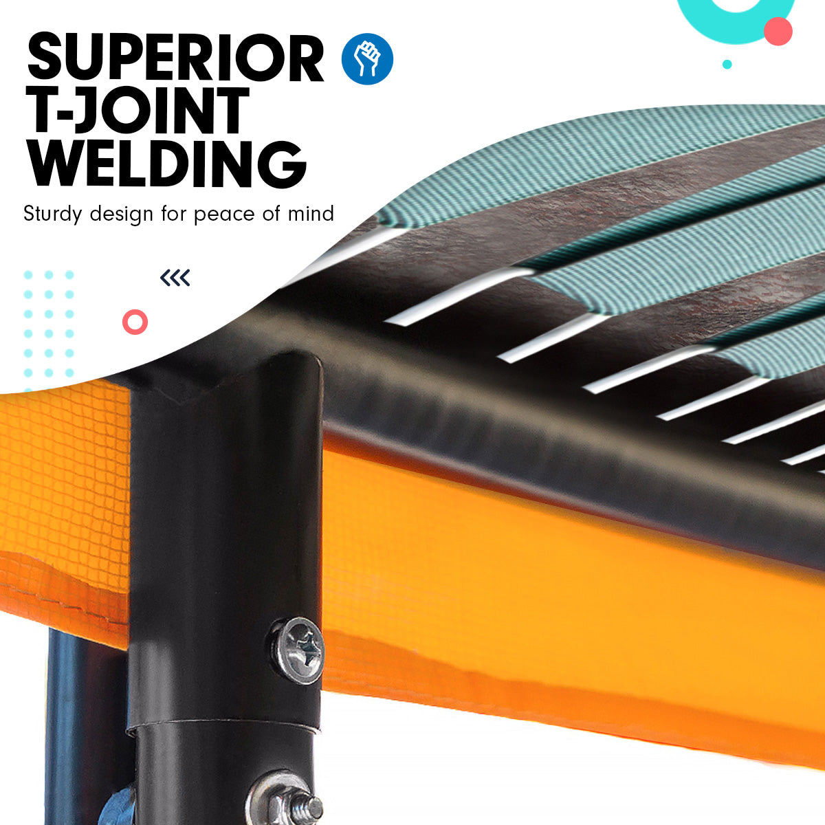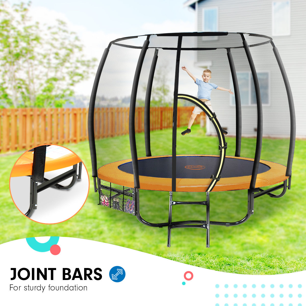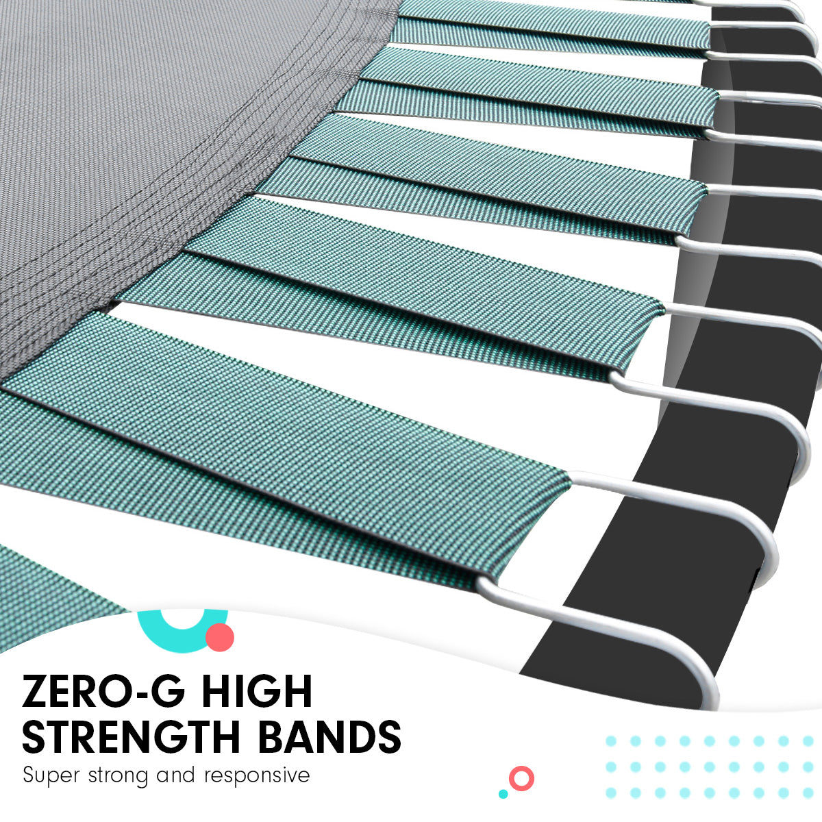 This springless trampoline also comes equipped with U-shaped legs and a ground anchoring kit to ensure stability and reduce the risk of the trampoline toppling over or sinking. Additionally, the Kahuna Twister Springless Trampoline has a hanging mesh compartment, a ladder and two pairs of anti-slip jumping socks for added safety.