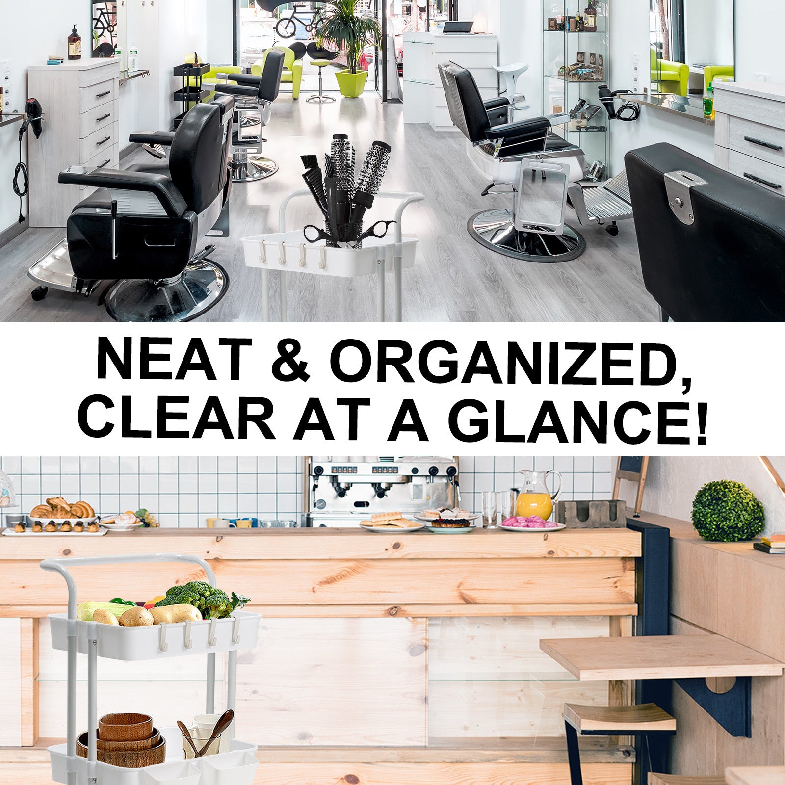 Spacious Storage Capacity: Equipped with removable hooks and hanging cups. Partition to store your various objects, neat and clear at a glance. This kitchen utility cart with wheels provides large storage space while saving you floor space to optimize the space utilization as much as possible; great storage solution for a kitchen, or use it for your pantry, office, garage, laundry supplies, toys, stationeries, or any other multitude of possibilities, etc.
