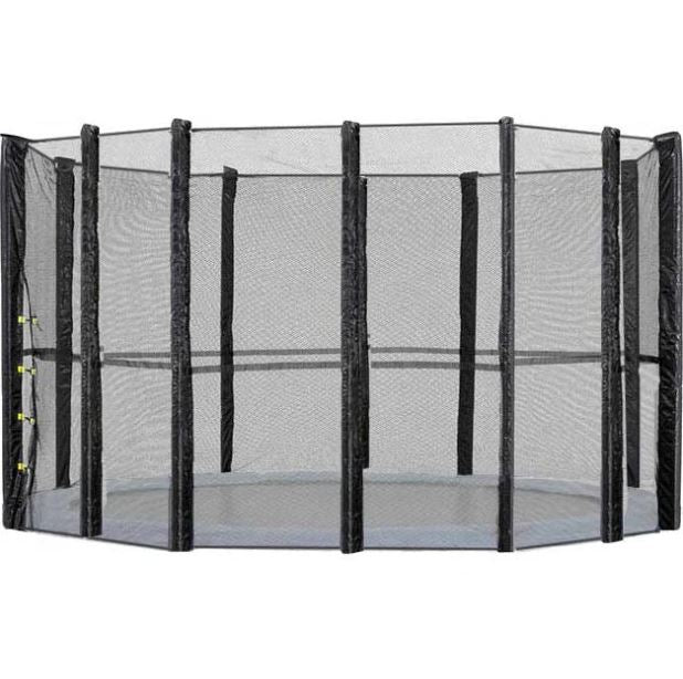 The net is made from tough weatherproof polyethylene and has elastic straps with clips around the lower edge. The entry door uses a high-quality zip secured next to one of the poles, and to the outer edge of the trampoline.