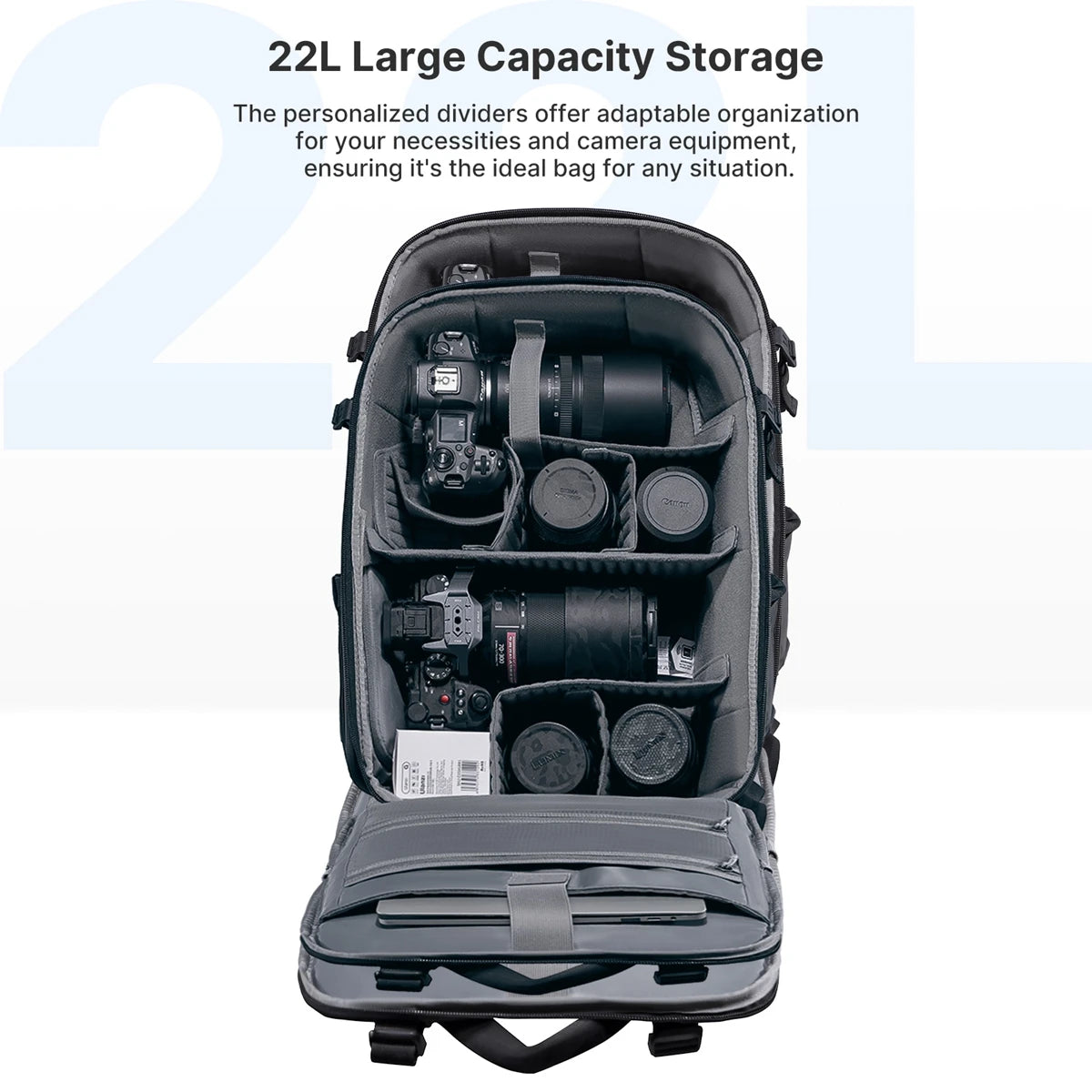 22L Large Capacity: Spacious main compartment fits up to 2 cameras, 4 lenses, and accessories. Adjustable dividers allow custom organization for camera gear or personal items.