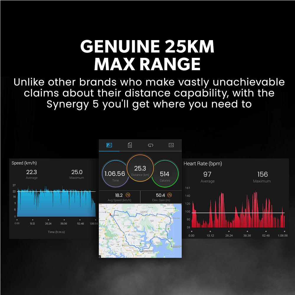 Despite a massive battery system and a heavy-duty motor, the Synergy 5™ weighs in at a reasonable 12.5kg thanks to a premium aluminium frame. The frame boasts superb torsional strength for optimal handling and to prevent breakages that other models experience.