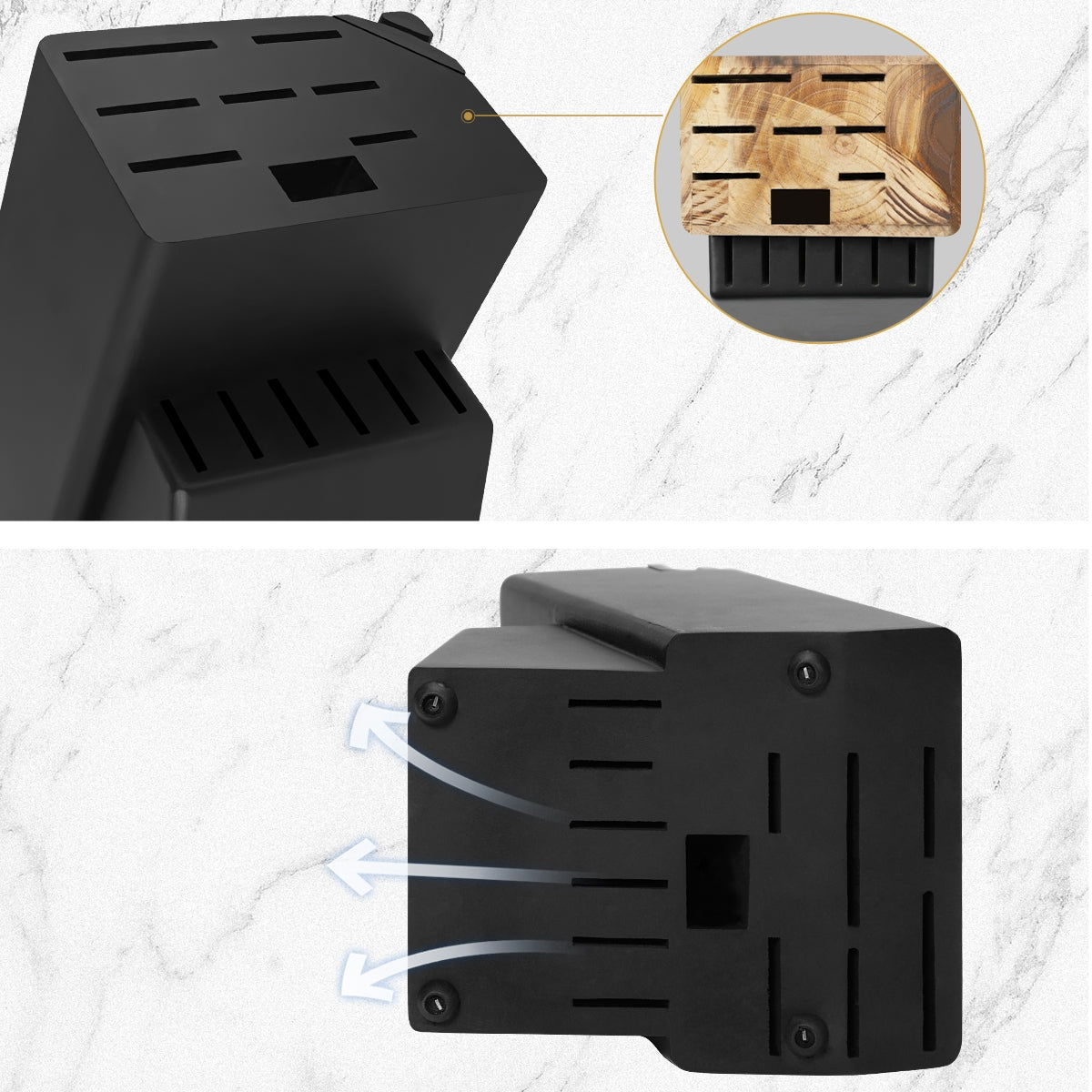 To protect the sharpness and glossiness of the knives, we recommend hand washing and promptly dry your knives after usage. All knives store safely in the wood knife block for space-efficient storage. The wooden block is ventilated and breathable, effectively prevent rust on knives.