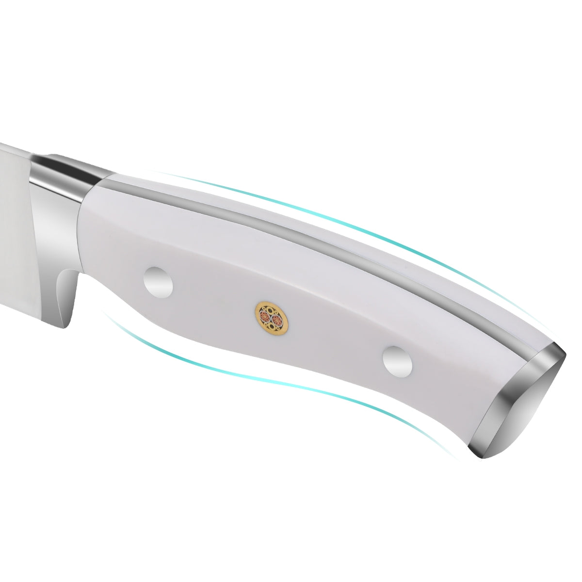 Color: 7-Pcs White Handle Brand: warmot Blade Material: German 1.4116 Stainless Steel Blade Edge: Plain Style: Ergonomic 8-inch Chef knife × 1 8-inch Slicer knife × 1 8-inch Bread knife × 1 7-inch Santoku knife × 1 5.5-inch Serrated utility knife × 1 5-inch Utility knife × 1 3.5-inch Paring knife × 1