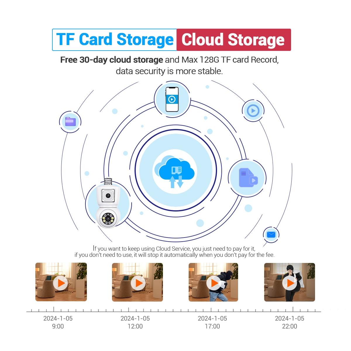 • Supports up to 128GB TF card and free 30-day cloud storage