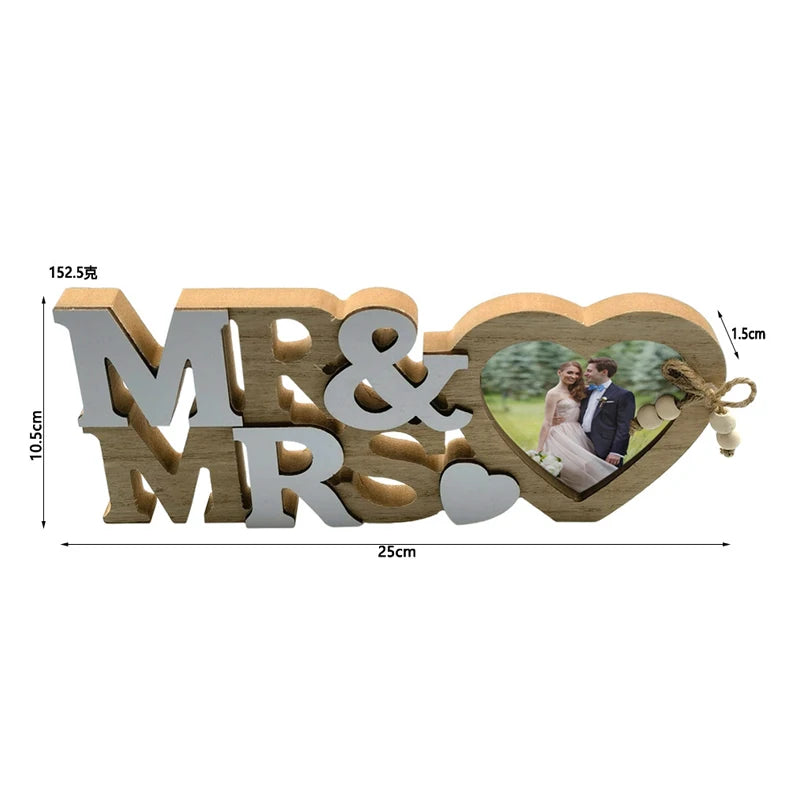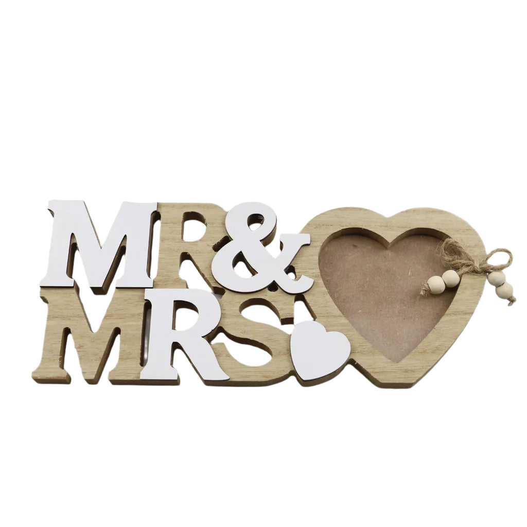 The NNEOBA Mr & Mrs Love Heart Photo Frame is a beautiful addition to any wedding or home décor. Crafted from high-quality wood, this heart-shaped frame is designed to hold a special photo of your loved ones. Whether as a wedding gift or a Valentine's Day keepsake, it brings warmth and charm to any space. This wooden ornament will beautifully complement your home table or wedding setup.