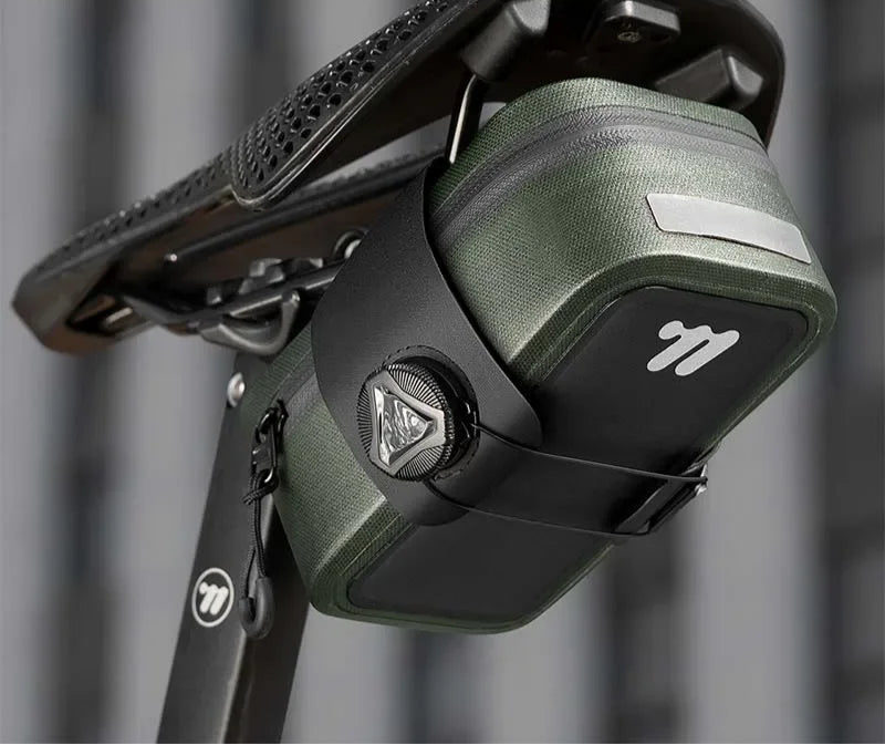 Despite its compact size, the interior is efficiently designed to hold your ride-day necessities such as keys, repair tools, or a compact phone. The innovative rotating lacing buckle system makes it easy to access your items securely, even while in motion. Whether you're a commuter or a weekend adventurer, this green mini saddlebag is a stylish, reliable addition to your biking gear.