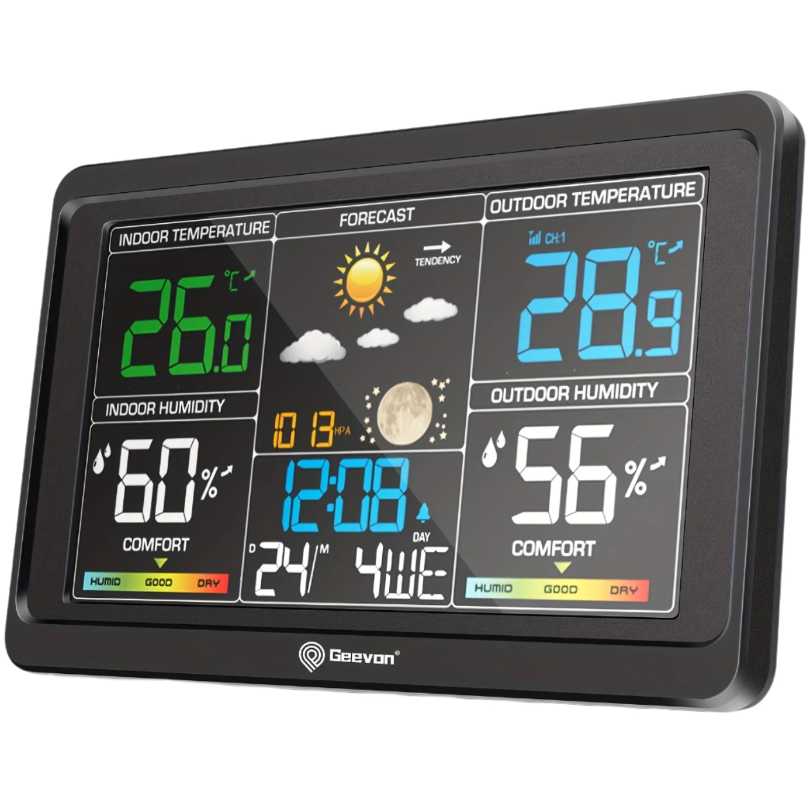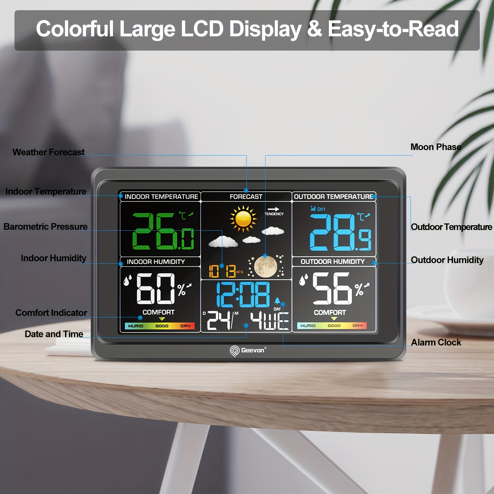 Monitor indoor and outdoor climate easily with this NNETM wireless weather station featuring a large LCD display, adjustable backlight, and USB charging port.