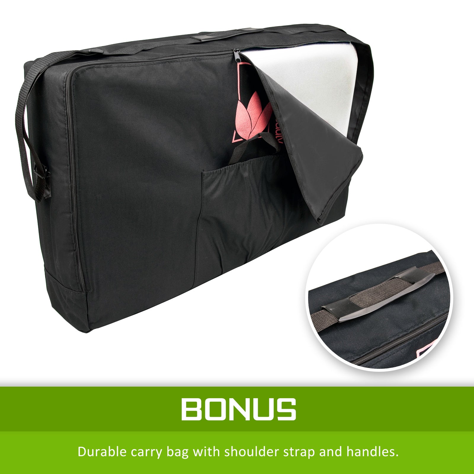 The upholstery is comprised of three-inch thick high density small-cell foam padding and oil water-proof polyurethane vinyl. The heavy duty aluminium frame is strong and light weight, so if you need to transport it for work or simply need to rearrange your work environment it can be done very easily. In addition, it can be very compact when folded so it is easy to store and keep your storage tidy. It comes with a carry bag to add to your convenience and also to keep it clean when not in use. This massage table is ideal for students, new practitioners, and home users with limited budgets.